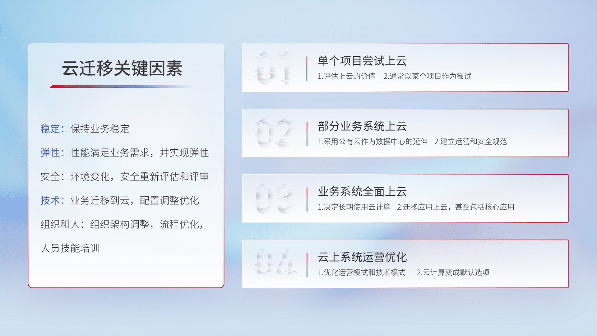 结合实际业务,,,,从规划设计、、、、云平台选型、、云原生改造、、、、数据迁移、、集成交付,,,,迁移全过程为客户识别最佳上云路径,,,,做好风险识别管理,,设计网络架构、、身份权限、、、、安全审计合规、、、操作审计、、日志审计、、监控告警策略、、多站点容灾设计等,,对云上基础设施进行整体规划,,提升IT治理水平,,,以满足弹性、、、、高可用、、、高性能的需求。。